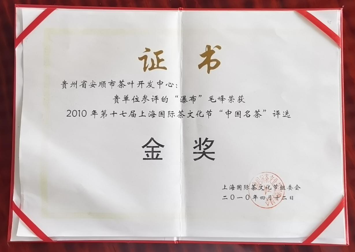 榮譽(yù)資質(zhì) “瀑布”毛峰榮獲2010年第十七屆上海國(guó)際茶文化節(jié)“中國(guó)名茶”評(píng)選金獎(jiǎng)