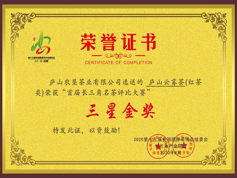 廬山農(nóng)墾茶業(yè)有限公司選送的 廬山云霧茶(紅茶類)榮獲首屆長三角名茶評比大賽 三星金獎