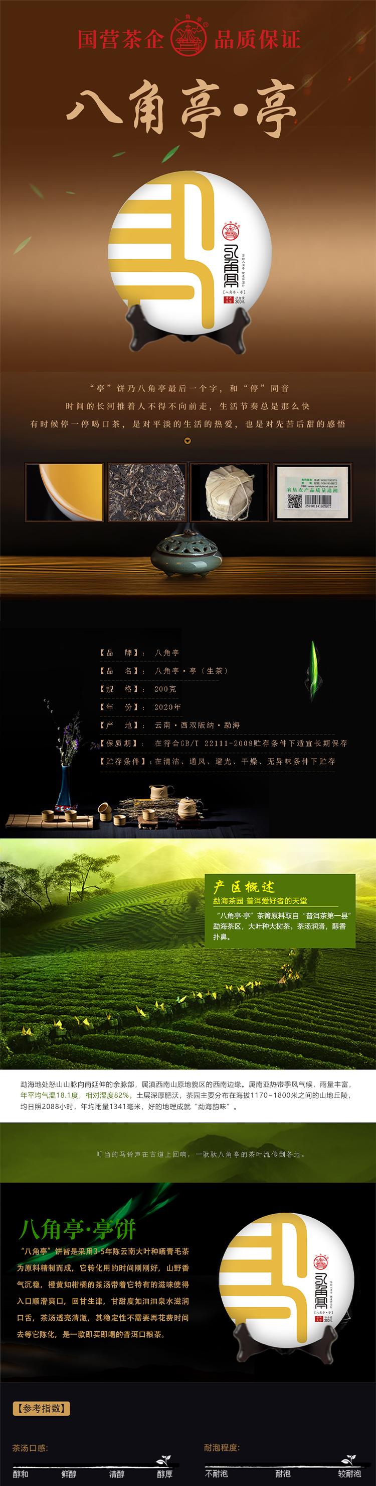 云墾茶業(yè)集團(tuán)下屬茶葉生產(chǎn)企業(yè)——云南農(nóng)墾集團(tuán)勐海八角亭茶業(yè)有限公司原名黎明茶廠,是我國歷史最為悠久的茶企之一,曾位列“中國普洱茶十大知名品牌”“十大最受歡迎茶葉品牌”、“中國普洱茶十大暢銷品牌”中,成為今天市場上最有影響力的品牌之一。公司產(chǎn)品獲得“綠色食品”、ISO9001、 HACCP和云茶品牌(YC)4項認(rèn)證,連續(xù)獲得“云南名牌農(nóng)產(chǎn)品”“云南名牌產(chǎn)品”“云南省著名商標(biāo)”等品牌榮譽(yù),公司生產(chǎn)的多款普洱茶在歷次專業(yè)評比中多次獲得特等金獎和金獎。在2018第五屆中國企業(yè)五星品牌論壇上,云南農(nóng)墾集團(tuán)勐海八角亭茶業(yè)有限公司上榜中國普洱茶行業(yè)影響力品牌——“金芽獎”,公司負(fù)責(zé)人陳勝軍先生獲“陸羽獎”,被授予2017“國際十大杰出茶人”榮譽(yù)稱號。