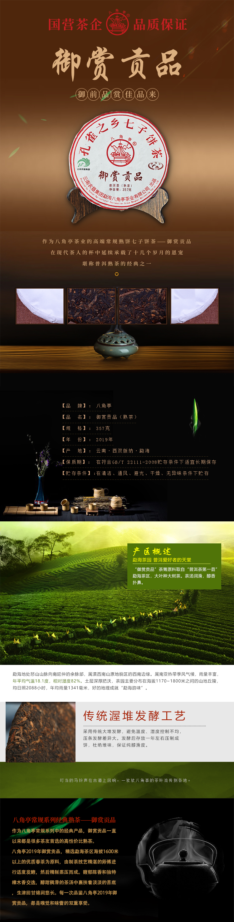 云墾茶業(yè)集團(tuán)下屬茶葉生產(chǎn)企業(yè)——云南農(nóng)墾集團(tuán)勐海八角亭茶業(yè)有限公司原名黎明茶廠,是我國(guó)歷史最為悠久的茶企之一,曾位列“中國(guó)普洱茶十大知名品牌”“十大最受歡迎茶葉品牌”、“中國(guó)普洱茶十大暢銷(xiāo)品牌”中,成為今天市場(chǎng)上最有影響力的品牌之一。公司產(chǎn)品獲得“綠色食品”、ISO9001、 HACCP和云茶品牌(YC)4項(xiàng)認(rèn)證,連續(xù)獲得“云南名牌農(nóng)產(chǎn)品”“云南名牌產(chǎn)品”“云南省著名商標(biāo)”等品牌榮譽(yù),公司生產(chǎn)的多款普洱茶在歷次專(zhuān)業(yè)評(píng)比中多次獲得特等金獎(jiǎng)和金獎(jiǎng)。在2018第五屆中國(guó)企業(yè)五星品牌論壇上,云南農(nóng)墾集團(tuán)勐海八角亭茶業(yè)有限公司上榜中國(guó)普洱茶行業(yè)影響力品牌——“金芽獎(jiǎng)”,公司負(fù)責(zé)人陳勝軍先生獲“陸羽獎(jiǎng)”,被授予2017“國(guó)際十大杰出茶人”榮譽(yù)稱(chēng)號(hào)。
