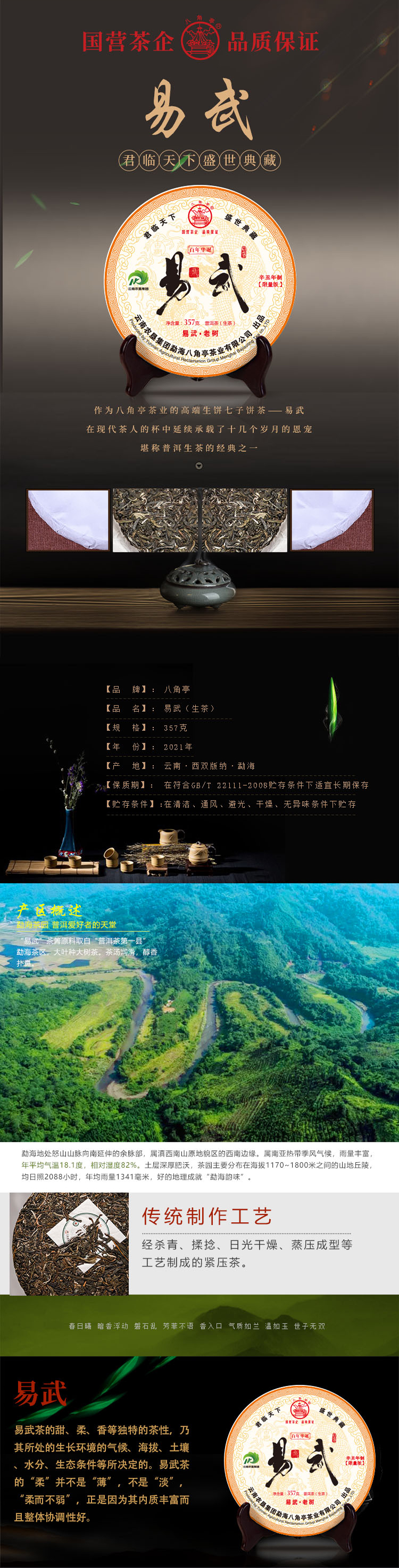 云墾茶業(yè)集團(tuán)下屬茶葉生產(chǎn)企業(yè)——云南農(nóng)墾集團(tuán)勐海八角亭茶業(yè)有限公司原名黎明茶廠,是我國歷史最為悠久的茶企之一,曾位列“中國普洱茶十大知名品牌”“十大最受歡迎茶葉品牌”、“中國普洱茶十大暢銷品牌”中,成為今天市場(chǎng)上最有影響力的品牌之一。公司產(chǎn)品獲得“綠色食品”、ISO9001、 HACCP和云茶品牌(YC)4項(xiàng)認(rèn)證,連續(xù)獲得“云南名牌農(nóng)產(chǎn)品”“云南名牌產(chǎn)品”“云南省著名商標(biāo)”等品牌榮譽(yù),公司生產(chǎn)的多款普洱茶在歷次專業(yè)評(píng)比中多次獲得特等金獎(jiǎng)和金獎(jiǎng)。在2018第五屆中國企業(yè)五星品牌論壇上,云南農(nóng)墾集團(tuán)勐海八角亭茶業(yè)有限公司上榜中國普洱茶行業(yè)影響力品牌——“金芽獎(jiǎng)”,公司負(fù)責(zé)人陳勝軍先生獲“陸羽獎(jiǎng)”,被授予2017“國際十大杰出茶人”榮譽(yù)稱號(hào)。