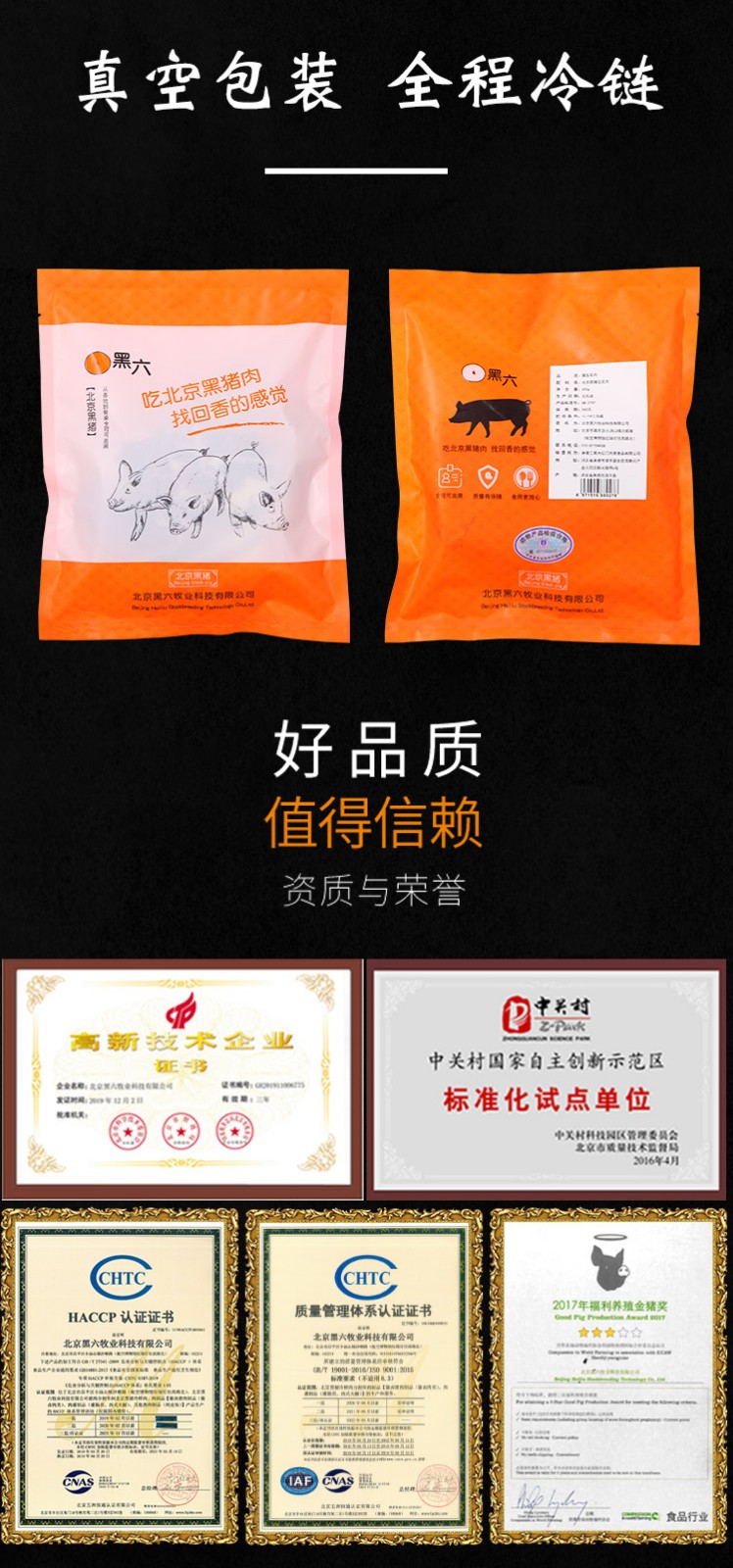 公司利用北京黑豬自有知識產權,通過科技支撐,建立了從基地到餐桌的安全、優質食用農產品加工的全程可追溯體系,“黑六”高品質豬肉受到廣大消費者關注和接受。隨著北京黑豬全產業鏈的延伸和發展,公司獨創的“黑六”品牌日益受到消費者青睞。“黑六”產品通過超市專賣、直銷、電商、餐飲等渠道步入了千家萬戶。被淡忘和追尋的肉嫩味美的北京黑豬肉通過黑六團隊的精心打造,再度成為消費者舌尖上的享受、餐桌上的靚麗一景。