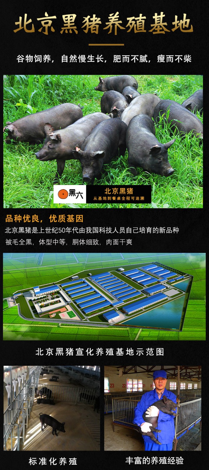 自公司成立以來,黑六團隊秉承“黑六”文化精髓,以飼養北京黑豬、弘揚民族品牌,滿足市場對差異化、特色安全優質豬肉的需求為企業使命,通過地方優良豬種飼養模式和“黑六”品牌建設的創新,展現了北京黑豬的卓越品質和風采,成為我國地方豬種和地方培育品種科學保護、有效開發、成功利用的典范。