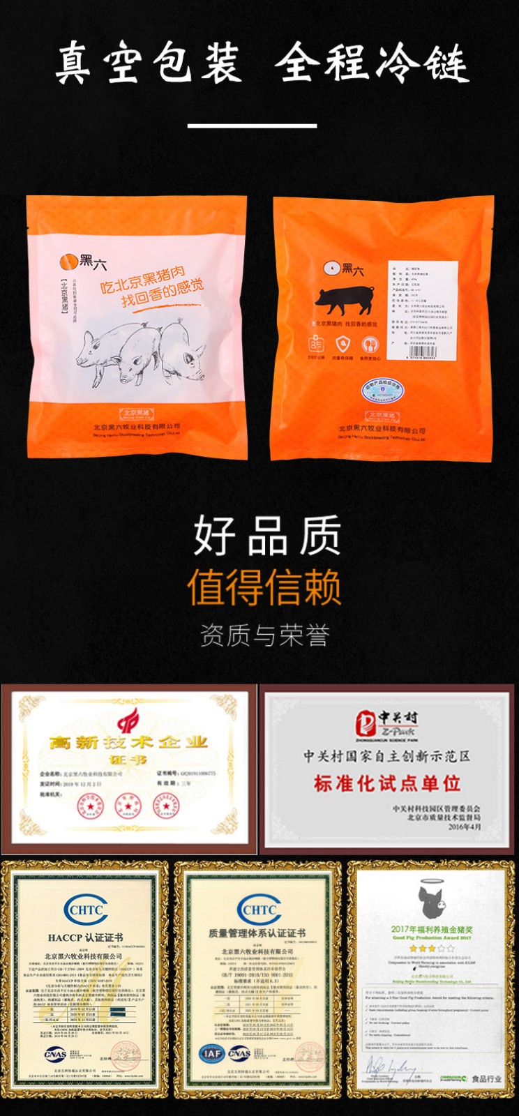 公司利用北京黑豬自有知識產(chǎn)權,通過科技支撐,建立了從基地到餐桌的安全、優(yōu)質食用農(nóng)產(chǎn)品加工的全程可追溯體系,“黑六”高品質豬肉受到廣大消費者關注和接受。隨著北京黑豬全產(chǎn)業(yè)鏈的延伸和發(fā)展,公司獨創(chuàng)的“黑六”品牌日益受到消費者青睞?!昂诹碑a(chǎn)品通過超市專賣、直銷、電商、餐飲等渠道步入了千家萬戶。被淡忘和追尋的肉嫩味美的北京黑豬肉通過黑六團隊的精心打造,再度成為消費者舌尖上的享受、餐桌上的靚麗一景。