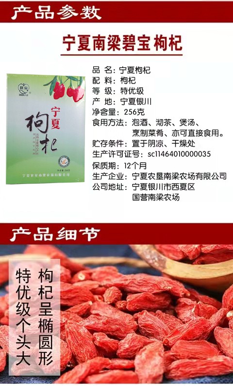 寧夏農(nóng)墾南梁農(nóng)場(chǎng)有限公司成立于1992年10月,隸屬于寧夏農(nóng)墾集團(tuán)有限公司,是集科研、開發(fā)、種植、生產(chǎn)、加工、銷售為一體的自治區(qū)級(jí)農(nóng)業(yè)產(chǎn)業(yè)化龍頭企業(yè)。南梁枸杞已有50多年的栽培歷史,所產(chǎn)枸杞以粒大、肉厚、籽少、味甜、藥效高而享譽(yù)全國(guó)。 南梁農(nóng)場(chǎng)枸杞基地先后被國(guó)家、自治區(qū)確立為“萬(wàn)畝優(yōu)質(zhì)富硒枸杞生產(chǎn)基地”,“農(nóng)業(yè)部無(wú)公害農(nóng)產(chǎn)品示范基地農(nóng)場(chǎng)”,“全國(guó)農(nóng)業(yè)標(biāo)準(zhǔn)化示范基地”,“自治區(qū)農(nóng)業(yè)產(chǎn)業(yè)化重點(diǎn)龍頭企業(yè)”等稱號(hào)。公司主要產(chǎn)品為“碧寶牌” SOD富硒枸杞、“南梁”牌枸杞。主導(dǎo)產(chǎn)品“碧寶牌” SOD富硒枸杞獲得國(guó)家專利和綠色食品證書,多次獲得中國(guó)農(nóng)業(yè)博覽會(huì)金獎(jiǎng)、馬來(lái)西亞國(guó)際金獎(jiǎng)、兩屆中國(guó)專利新技術(shù)新產(chǎn)品博覽會(huì)金獎(jiǎng)在內(nèi)的多項(xiàng)國(guó)際國(guó)內(nèi)金獎(jiǎng)。