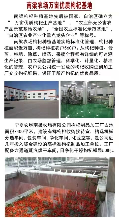 寧夏農(nóng)墾南梁農(nóng)場(chǎng)有限公司【原寧夏枸杞企業(yè)(集團(tuán))公司】成立于1992年8月,位于銀川市西夏區(qū)南梁農(nóng)場(chǎng),是寧夏農(nóng)墾集團(tuán)有限公司所屬的枸杞種植、加工、銷售為一體的專業(yè)化公司。已有50多年的枸杞栽培歷史,所產(chǎn)枸杞素以粒大、肉厚、籽少、味甜、藥效高而居寧夏枸杞之冠。